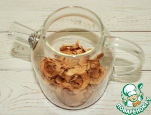 Чайник ополоснуть кипятком, поместить в него сушеные яблоки.