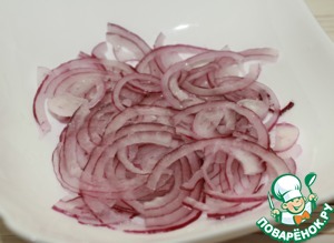 Нарезать лук полукольцами и присыпать сахаром с солью, дать настояться минут 7-10.