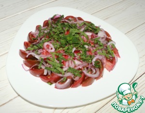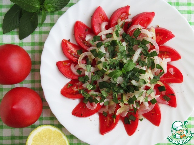 Посыпать нарезанной мятой, полить заправкой и можно подавать к столу.