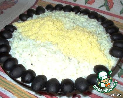 Сверху посыпать тертым яйцом (крылья желтком, можно наоборот). Украсить по краю половинками маслин. -