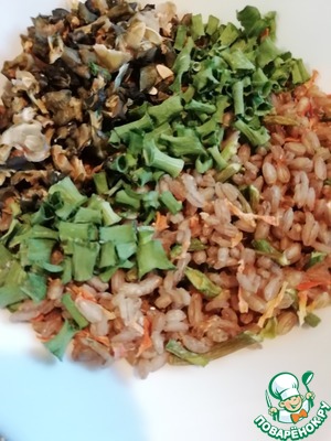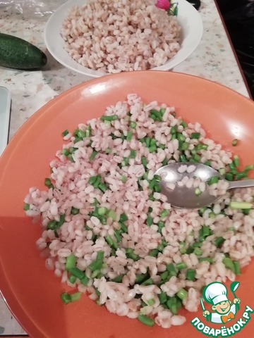 Теперь перловка.. Замочить, промыть несколько раз и поставить вариться. От указанного веса крупы при готовности я взяла не всё, когда перловка доварилась до вкусного кусабельного состояния я выключила плиту и прикрыла кастрюлю полотенцем. Минут через 10 самый верхний слой перекинула в широкий салатник и смешала с нарезанными стрелками чеснока, цель была обогатить часть крупы ароматом и тепмературно пробить стрелки, они плохо сушатся. В другую посуду выбрала максимально сухую часть готовой крупы, то что осталось внизу первоначальной варки - пустили на гарнир