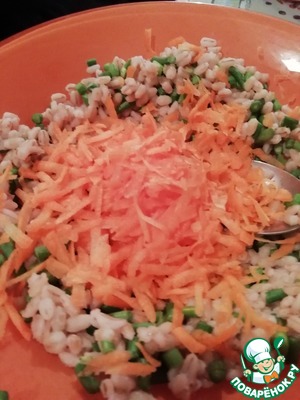 Зеленый лук пустила частично в смесь, основную часть убрала в другую тару, ибо перловку хоть и вареную готовить с картошечкой по времени одинаково...