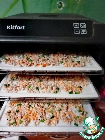 Когда основная температура по обеим группам снизится до тёплой (влага по физике уходит), смешиваем и раскладываем в сушилку.
