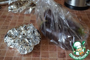 Баклажаны поместить в пакет для выпечки, завязать пакет, сделать несколько проколов для выхода пара.