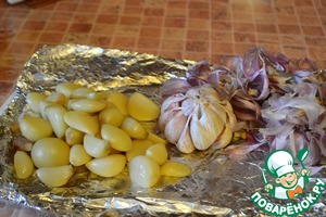Нужно очистить головки чеснока от внешней шелухи, завернуть головки целиком в фольгу и запечь при 180° в течение 40 минут. Остудить, очистить. -