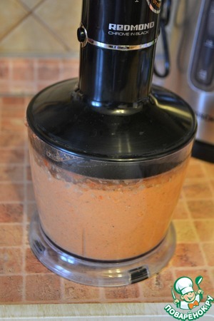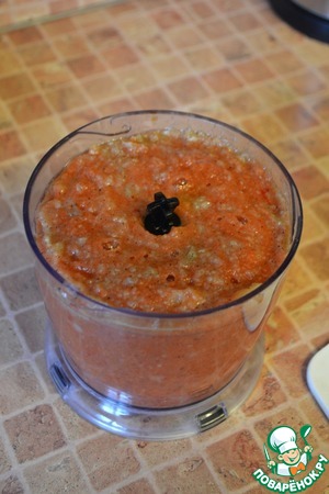 Очищенный чеснок и очищенные от хвостиков перцы с соком, который выделился в процессе приготовления, измельчить блендером до однородности.