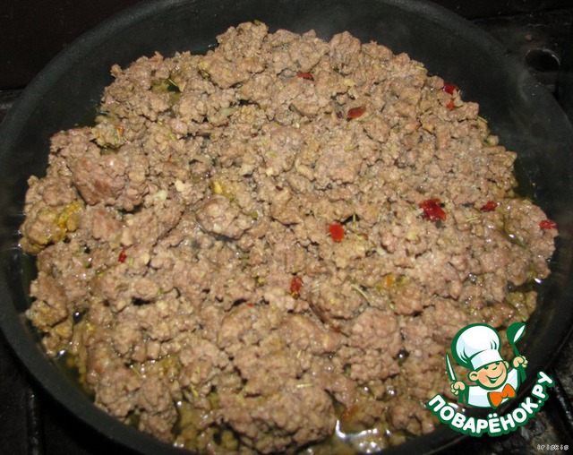 • В это время обжариваем фарш на сковороде с приправками (у меня перец красный сладкий лепестками, белый перец, куркума, розмарин, имбирь)