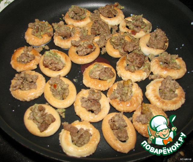 • Когда сушечки немного размокнут, выкладываем их на сковороду и начиняем каждую фаршем