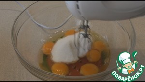 Берем 6 яиц, добавляем 6 ст л сахара и хорошо взобьем миксером минут 5, чтобы яйца побелели и масса увеличилась в объёме.