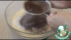 Просеем 3,5 ст л муки, потом 2 ст л какао и 2 ч л разрыхлителя. Хорошо размешаем венчиком, чтобы не было комочков.