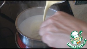 В кипящее молоко вливаем тонкой струйкой пудинговую массу и варим постоянно помешивая до загустения. Потом убираем с плиты крем.