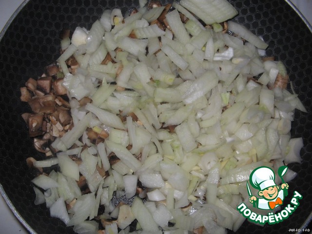 Шампиньоны нарезать некрупно. Обжарить на растительном масле.