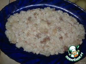 • Первым слоем на блюдо выложить нарезанную рыбу. Но она, скорее, не резаться будет, а разминаться, так как очень нежная.