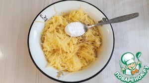 Далее в миску с луковой кашицей натереть на терке картофель (600 гр.) Для этого использовать насадку для приготовления моркови по-корейски с мелким сечением.