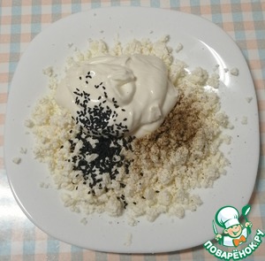 Фету раздавить вилкой, добавить йогурт, семена кунжута, поперчить по вкусу и всё хорошо перемешать.