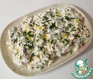 Выложить на блюдо. Посыпать сверху ещё кунжутом и зелёным луком и сбрызнуть оливковым маслом.