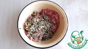 • Далее добавить смесь пассерованного лука и грибов. Фарш хорошо вымешать. Если, на ваш взгляд, фарш будет слишком плотным, можно добавить небольшое количество воды или молока.