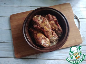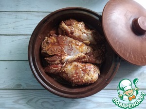 Плечо индейки нужно замариновать на ночь. Хорошо помыть куски, обсушить бумажным полотенцем. В миске сделать маринад, соединив соевый соус, масло оливковое, соус томатный, горчицу зернистую (любую), прованские травы, базилик, перец кайен (любой вами любимый перец), посолить по вкусу, не забывая о соевом соусе и томатном соусе. Тщательно натереть куски индейки со всех сторон этой смесью, втирая маринад пальцами в мясо. Поместить в посуду. Добавить порезанный чеснок. Я буду мариновать в глиняной посуде, затем там же запекать. Натёрла маринадом, накрыла крышкой и отправила в холодильник на ночь. На утро маринад хорошо впитался и я поставила индейку запекаться, выставив т-180 С и время -1 час.