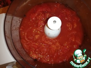 Перекрутить помидоры с помощью миксера или блендера.