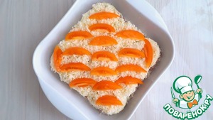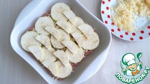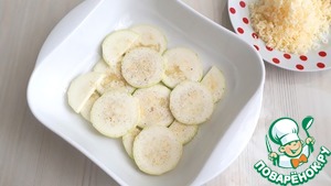 На дно формы добавить 2 ст. ложки кукурузного масла, выложить первый слой кабачковых колечек. Слой слегка присолить и присыпать по вкусу черным молотым перцем. Если вы готовите блюдо для детского питания, перец следует исключить. Сыр (300 гр.) натереть на терке, слегка присыпать кабачковые колечки сыром.