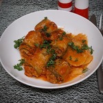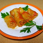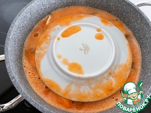 Накрываем тарелкой и сверху заливаем томатным соком. Можно потушить помидоры и до нужного количества добавить воды. Или в 2 стаканах воды развести 1 ст. ложку томатной пасты. Тарелка нужна, чтобы рулеты не всплывали и не разворачивались.