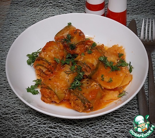 В емкость, в которой будем готовить, на дно выкладываем порезанную пластинами картошку. Сверху на нее плотно укладываем рулетики. Картошка защитит нежные рулеты от подгорания, раскисания и придаст соусу нужную консистенцию.
