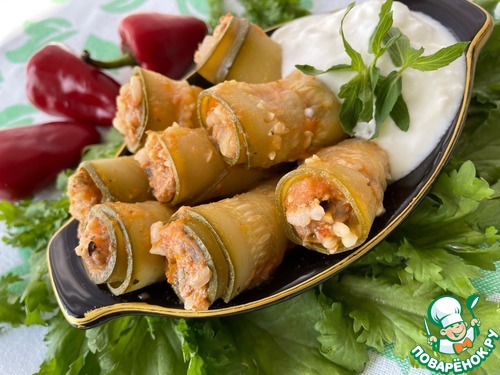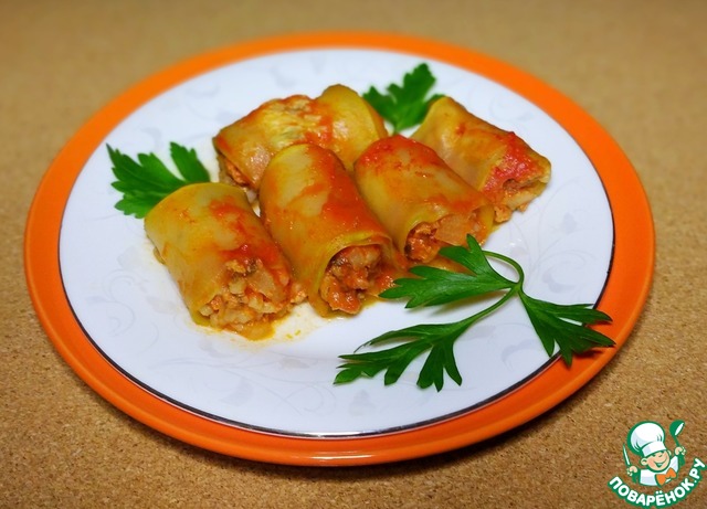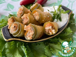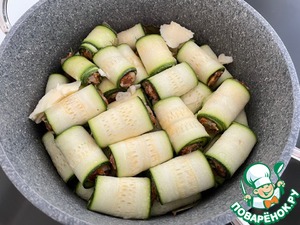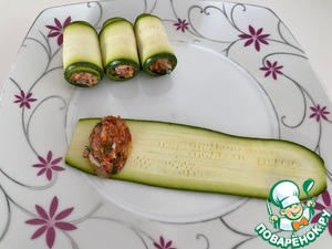 На край пластины кабачка выкладываем чайную ложку фарша и плотно сворачиваем в рулет.