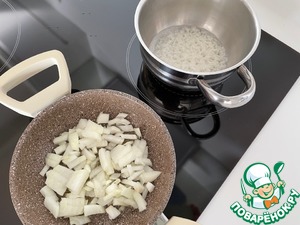 Обжариваем измельченный лук и варим до полуготовности рис, примерно 10 мин.