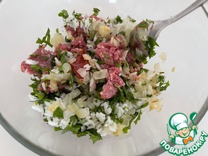 К фаршу добавляем: обжаренный лук, рис, томатную пасту, измельченный чеснок, мелко порезанную зелень (у меня петрушка и укроп). Солим-перчим, добавляем любимые специи. Хорошо вымешиваем.