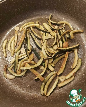 • Брусочки цуккини обжарить в смеси растительного и сливочного масла, за минуту до окончания жарки добавить слайсы чеснока.