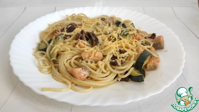 Рецепт «Спагетти с цуккини, лососем и вялеными томатами»: