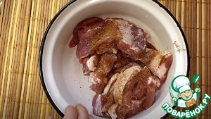 4) Солим, перчим и посыпаем приправой для мяса или смесью приправ. Перемешиваем и убираем в сторону.