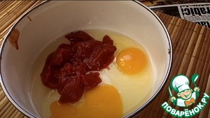 5) Далее делаем кляр. В миску вбиваем 2 яйца куриных и добавляем 2 ст. л томатной пасты, взбиваем.