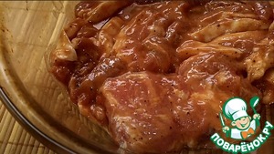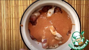 7) Эту свиную грудинку я решил залечить в духовке. Поэтому кляр переливаем к кусочкам свиной грудинки и перемешиваем.