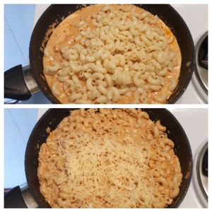 Положить в сковородку отваренные рожки и тертый сыр, все хорошо перемешать.