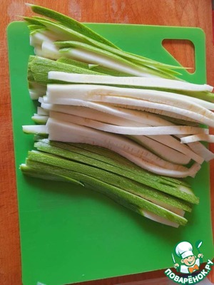 Нарежьте кабачок тонкой соломкой - в этом одна из фишек салата, так он получается красивым и особенно вкусным.