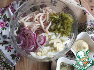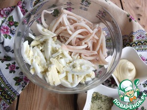 Для салата я взяла очищенные тушки кальмаров. Для варки воспользовалась "быстрым способом" - опустила тушки в кипящую, подсоленную воду на 2 минуты. Остудила.