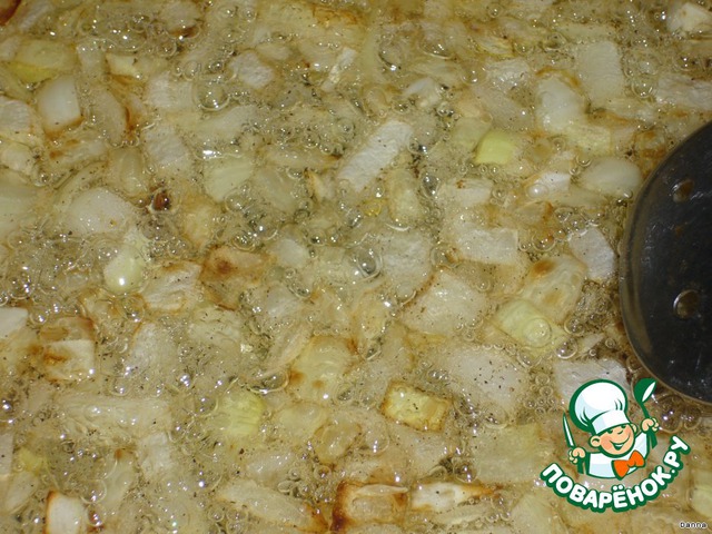 В сковородку влить чуть постного масла для жарки, выложить мелко нарезанный лук и спассеровать до золотистого цвета.