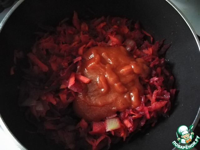 Далее добавляем соус "Краснодарский". Соус "Краснодарский" кисло-сладкий. Он сохранит свекольный цвет. Если будите добавлять пасту томатную, то налейте немного уксуса 7 %, примерно 1 ст л и положите сахар 0,5 ст л.