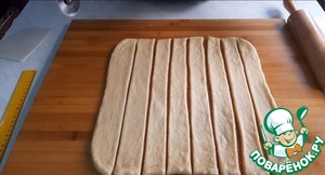 Делим тесто на 2 части. Раскатываем каждый кусочек в пласт толщиной 7 мм. Смазываем сливочным маслом и нарезаем на полоски толщиной 3-3.5 см.