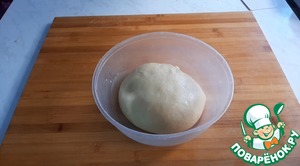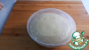 Замешиваем тесто. Убираем в миску смазанную растительным маслом. Прикрываем пищевой плёнкой и оставляем на подъем на 1.5 часа.
