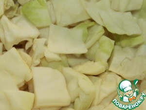 Первый слой - капусту нарезать квадратиками (примерно 4 см.) и выложить 1/2 часть в подходящую посуду.