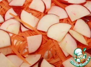 Второй слой - выложить на капусту 1/2 часть тертой моркови и 1/2 часть нарезанных яблок без сердцевины.