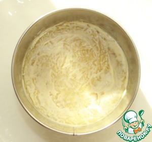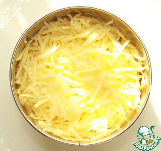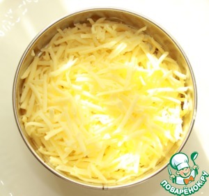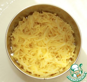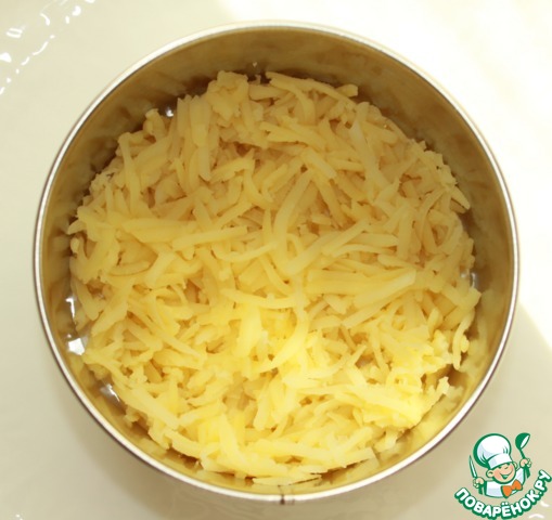 • Первый слой - натертый на средней терке отварной картофель + соль по вкусу.
