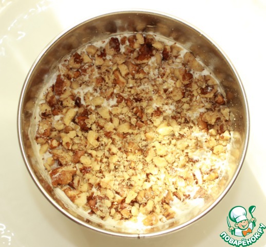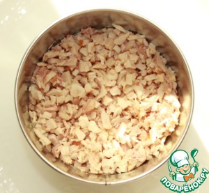 • Второй слой - нарезанная мелкими кубиками копченая/отварная курица.