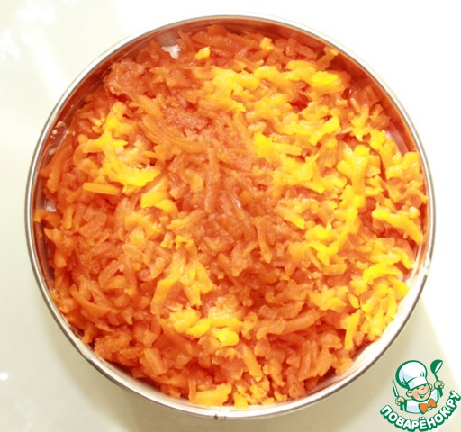 • Пятый слой - натертая на средней терке отварная морковь + соль по вкусу.