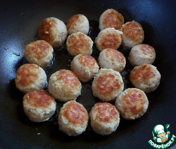 На сковороду, где ранее пассеровался репчатый лук (его переложите в тарелочку), выложите тефтельки о обжарьте с разных сторон до румяности.