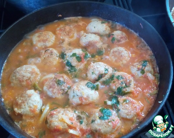 На отдельной сковороде обжарьте мелко нарезанные овощи, добавьте томатную пасту, подсолите. Вместе с остатками спассерованного репчатого лука переложите к тефтелькам, залейте кипячёной водой, доведите до кипения и готовьте в течение минут 20-25. За это время приготовьте гарнир. Перед окончанием готовки к тефтелькам добавьте мелко нарезанную зелень укропа и петрушки, веточки базилика, можете добавить 2 измельченных зубчика чеснока и лавровый лист.