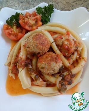 Подавайте с гарниром, тщательно полив его соусом, в котором готовились тефтельки. При подаче украсьте блюдо свежими овощами и зелью по своему усмотрению. Приятного аппетита!