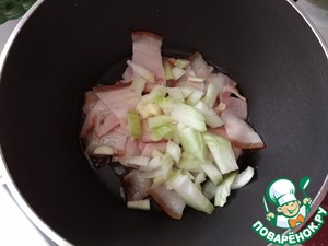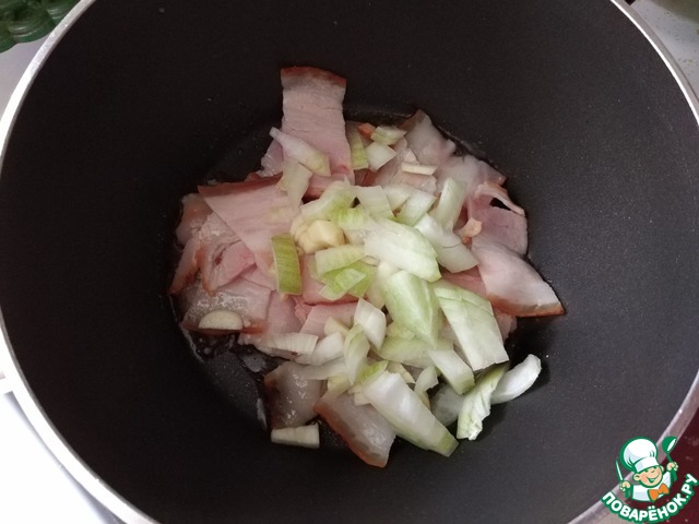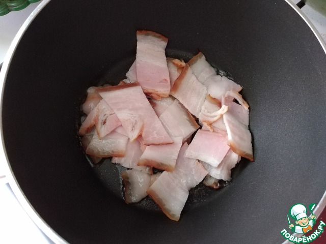 Ломтики бекона нарезаем на кусочки примерно 2,5 см шириной и отправляем в сотейник растопиться.